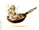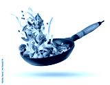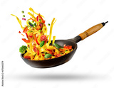 Cooking Italian pasta with vegetables flying over a hot frying pan isolated in white.