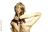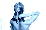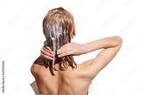 Back view of girl with wet hair, applying nutrition hair mask against white studio background. Conditioner treatment. Concept of beauty, hair care, treatment, natural cosmetics. Copy space for ad