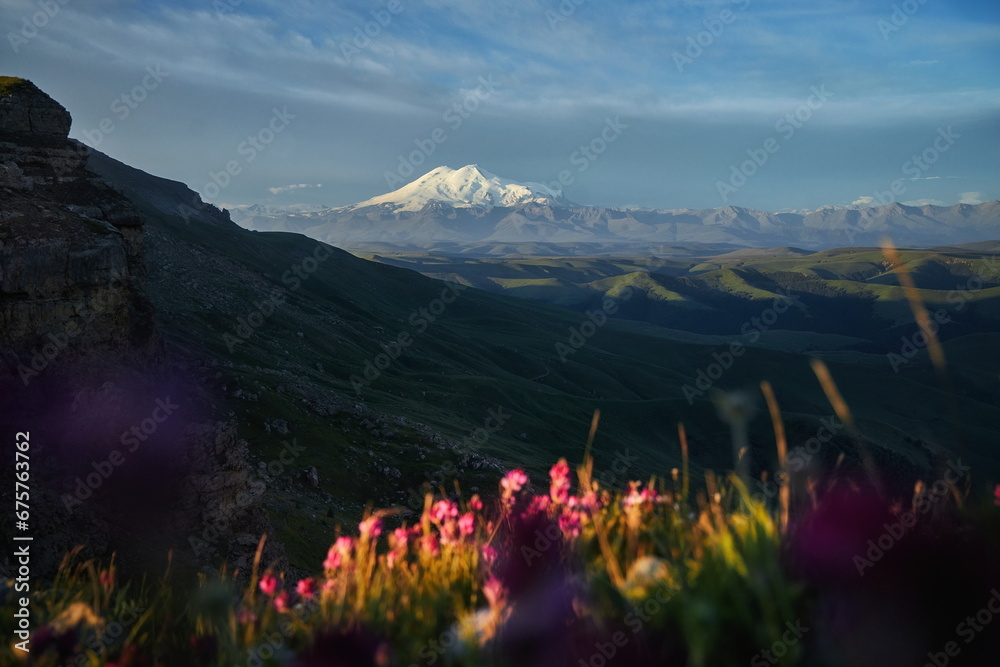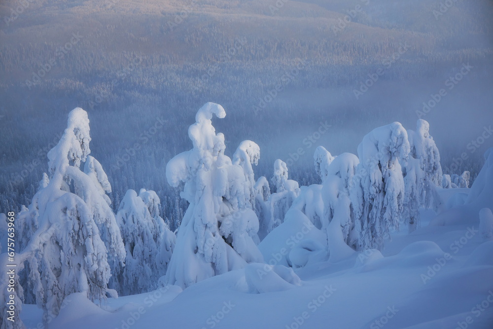 Snowy cold winter in the mountains landscape, trees in the snow in the morning, cold north wind. Ice fir trees, Christmas