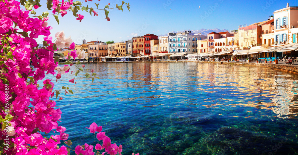clear turqiouse water of Chania habour at sunny day with flowers, Crete, Greece
