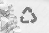 Eco friendly wooden and harmful plastic cutlery with recycling sign. Zero waste concept