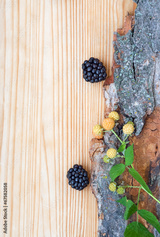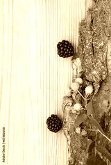 Blackberry, raspberry on wood, card