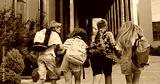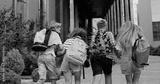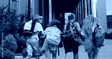 Rear view. Good-looking school child friends climb stairs going to class with backpacks. Boys and girls high school students having fun after school. They are smiling and having fun.