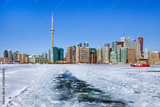 Toronto winter skyline with boat crossing the frozen bay