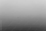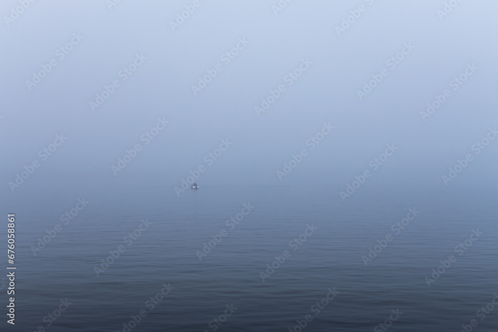Foggy tranquil dawn scenery, morning scenery with dense fog over the water's surface.