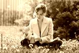 Portrait photo of a happy Caucasian woman relaxing in the sunlight in a park outdoors