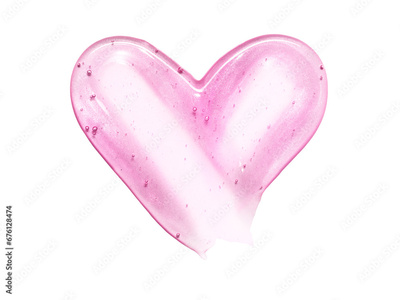 Pink lipstick shimmering texture in heart shape, texture stroke isolated on white background. Cosmetic product smear smudge swatch