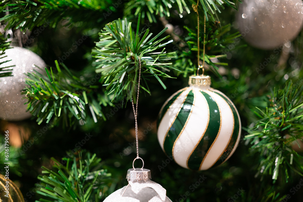 Closeup of ball hanging from a decorated Christmas tree. Close up of balls on Christmas tree. New Year concept.
