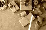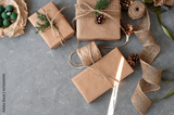 Sustainable Christmas celebration, preparation of presents. Homemade wrapping of gift boxes with craft brown paper, decoration with pine cones, twigs, jute cord. Ecological gift package