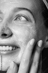 Skin care beauty portrait. Facial scrub young happy woman is applying white peeling cosmetic product to whole her face. Daily skincare routine. Dermatology. Exfoliating