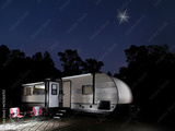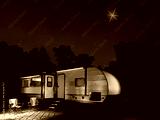 Christmas Eve at a remote campsite with a star shining brightly over a travel trailer.