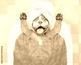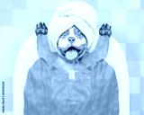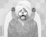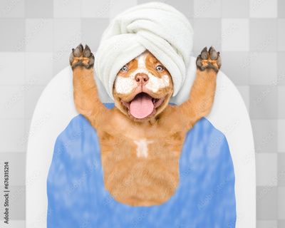 Happy Mastiff puppy with towel on it head and with cream on it face takes the bath at home. Top down view