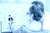Senior couple wearing medical mask celebrating birthday they grandson on video call during the coronavirus epidemic