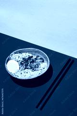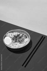 Asian culture, cuisine. Delicious recipes. Plate with noodles, egg and meet, served with greenery isolated red background.