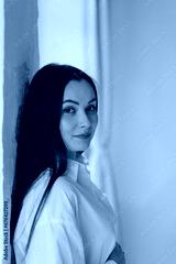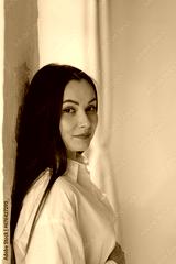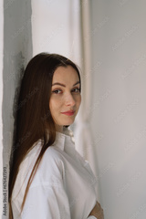 Cute young Pregnant girl sitting on the white studio in warm light with hands on pregnant stomach on wall background with shadow. Pregnant concept, free space, enjoying pregnancy. Pregnant body.