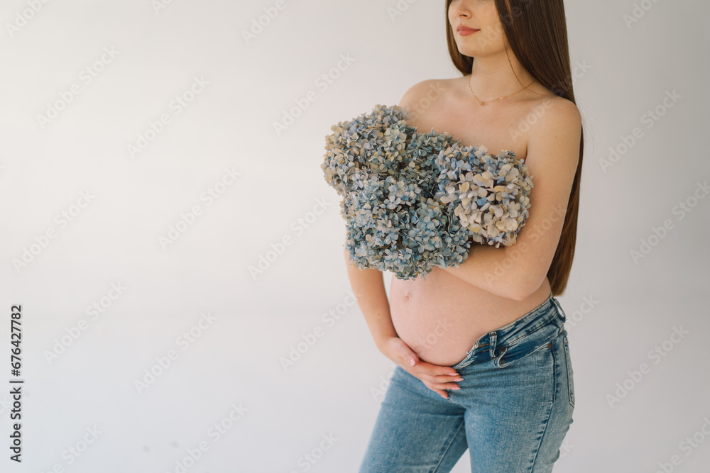 Pregnant girl with flowers in the cleavage area. Belly of pregnant woman. Close-up belly of a pregnant woman. Woman waiting for a newborn baby. Pregnant woman touches her belly indoors