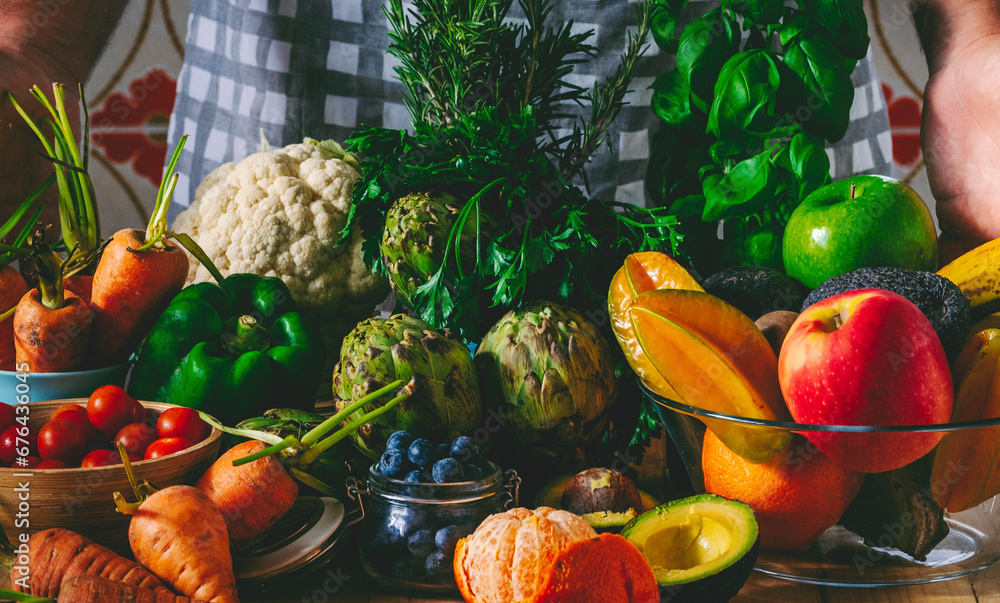 Unrecognizable man chef show his seasonal fresh sweet fruits and vegetables products on the table at home or restaurant. Salad healthy lifestyle ingredients for weight loss nutrition plan