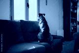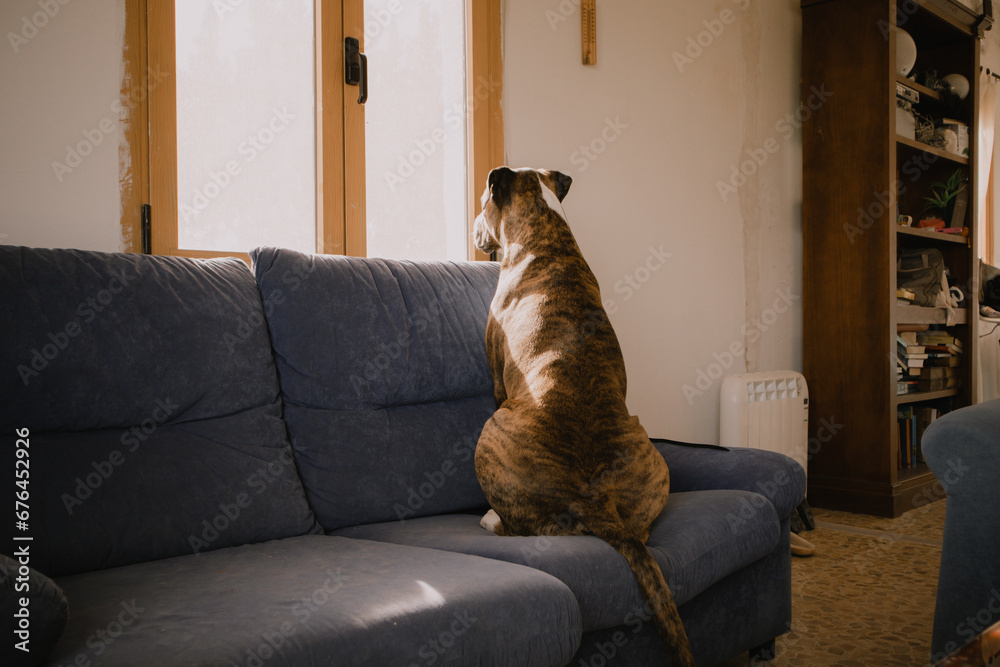 Devoted german brown boxer dog os looking in a window waiting for owner. A breed of short-haired service clever canine domestic animal resting indoors. Home guard. A pet. Loyalty, fidelity concept.
