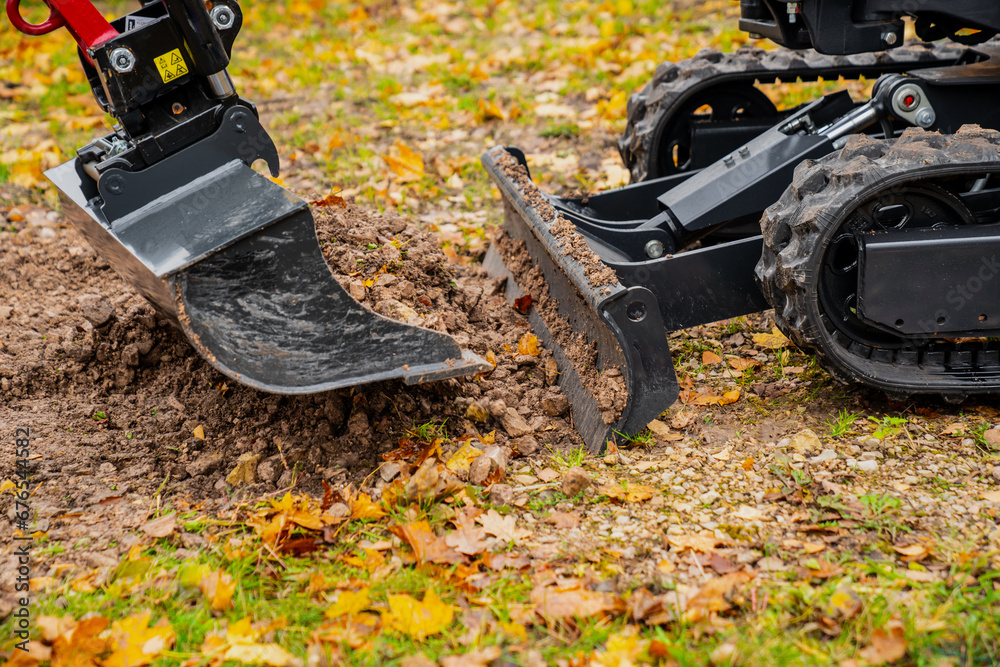 Construction buckets working with mini excavator on ground moving and flattening works in autumn with fallen leaves