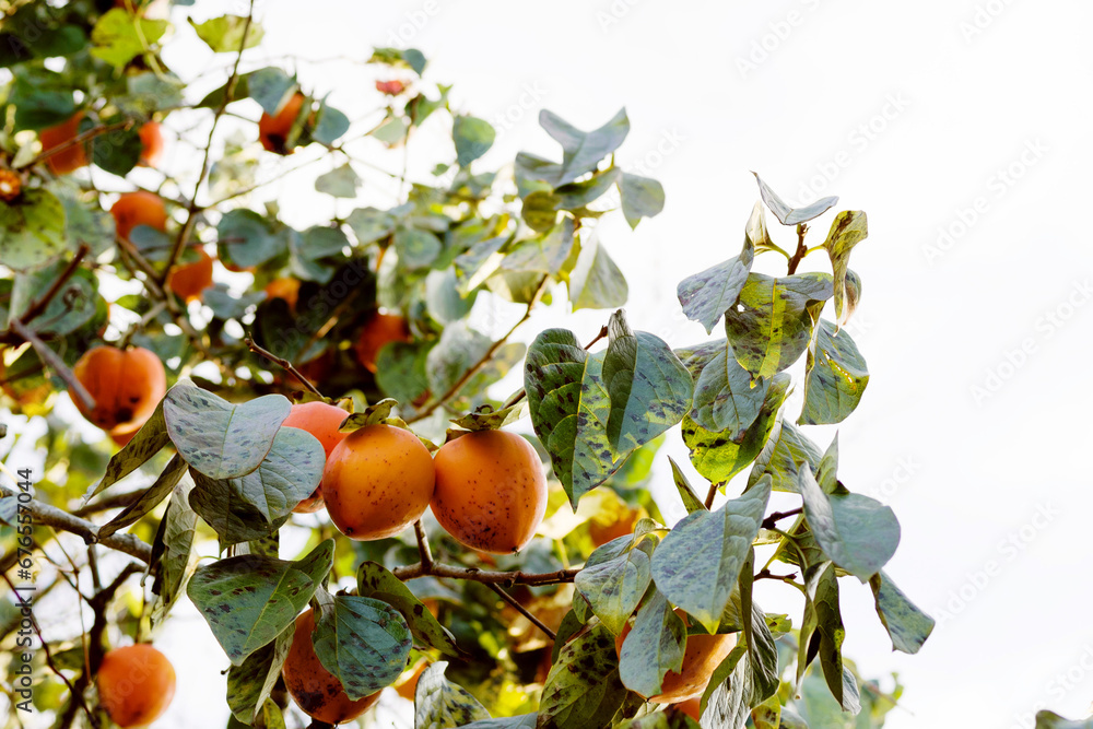 Fresh fruits of bright persimmon ripen on a tree branch, close-up, selective soft focus