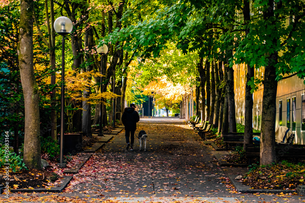 Person Walking on Path Under Colorful Fall Tunnel of Trees in Downtown Portland, OR