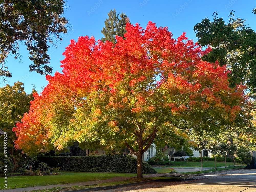 A large Chinese Pistachio is turning red in the autumn. It is planted in a parkway between the street and a house. There is a blue sky in the background