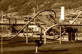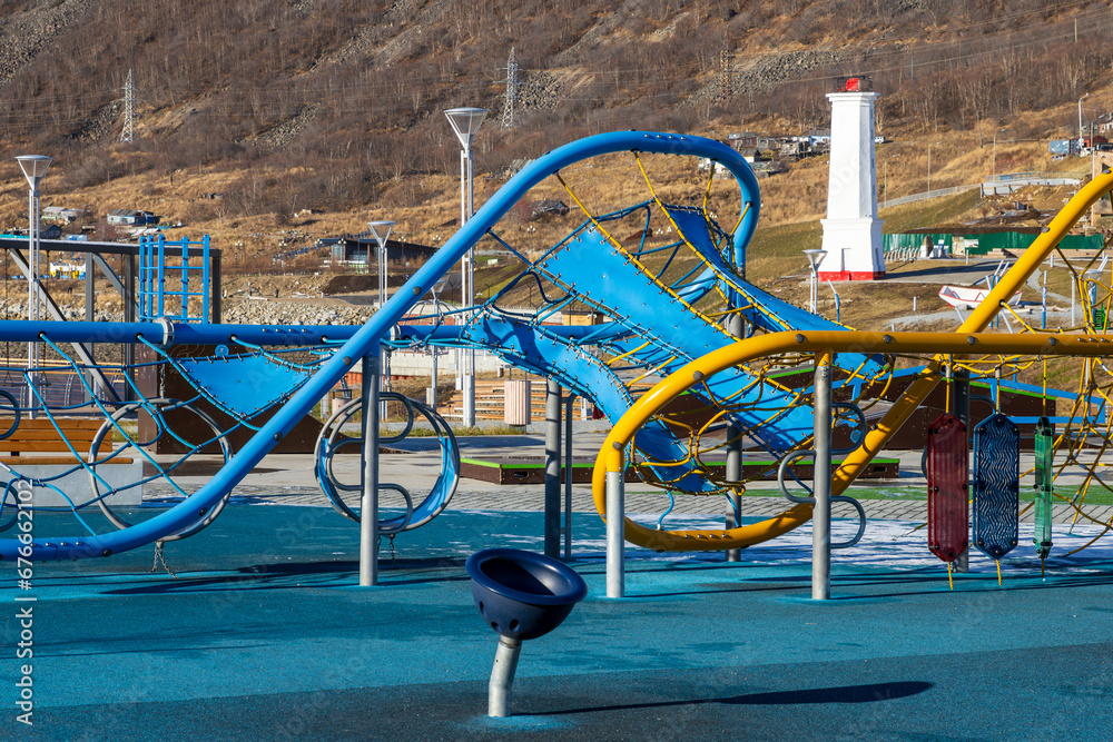 Modern children's playground. In the distance is a lighthouse (leading beacon). Mayak Park, Magadan city, Magadan region, Russia. Improvement in the Russian Far East.