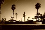 Green ornamental fountain in front of the Koutoubia Mosque on a sunny day.