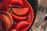 Moon shaped red wooden blocks (jiaobei) with one flat and one curved side in Buddhist Temple