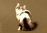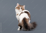 Bicolor harlequin scottish highland kitten with white on gray ba