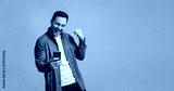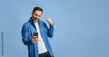 Successful male entrepreneur pumping fist after reading good news over cellphone on blue background