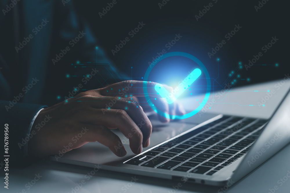 Quality control certificate concept. Businessman show high quality assurance award, warranty best customer service rank, ISO standard certificate, Market value, premium business quality assurance.