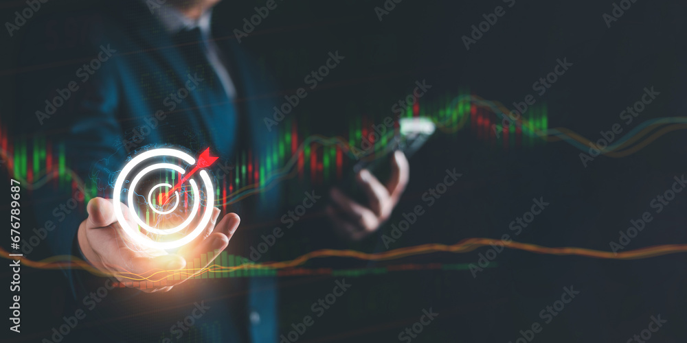 Business goal concept. Businessman analyzing, set and plan business goal achievement. Use KPI performance analysis trends marketing, economy, financial. Business growing to goal and achieve success