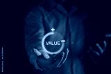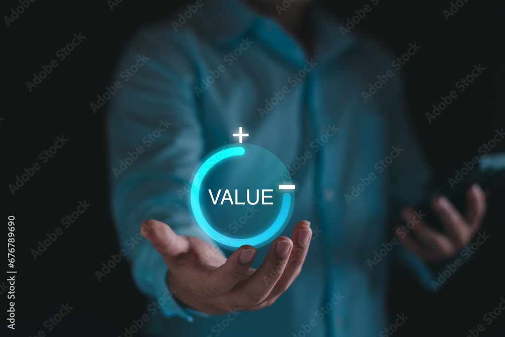 Value added concept. Businessman pulling up increase value added infographic to business product, market, financial, performance, investment and service. Business value growth