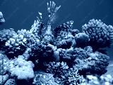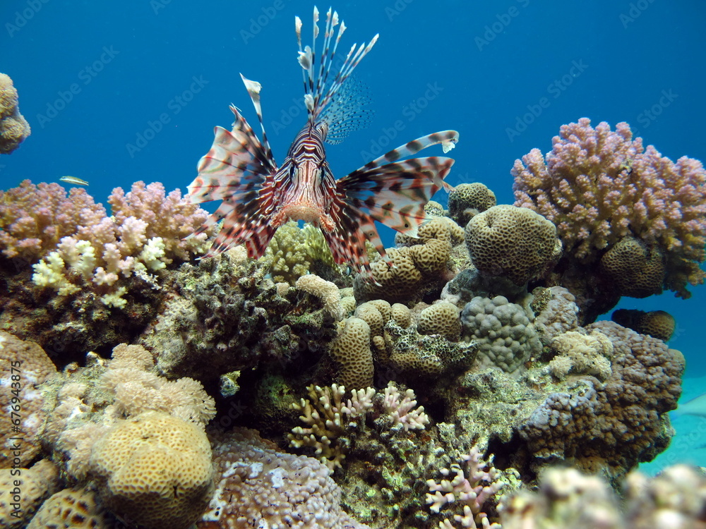 Lion Fish in the Red Sea. Lion Fish in the Red Sea in clear blue water hunting for food .