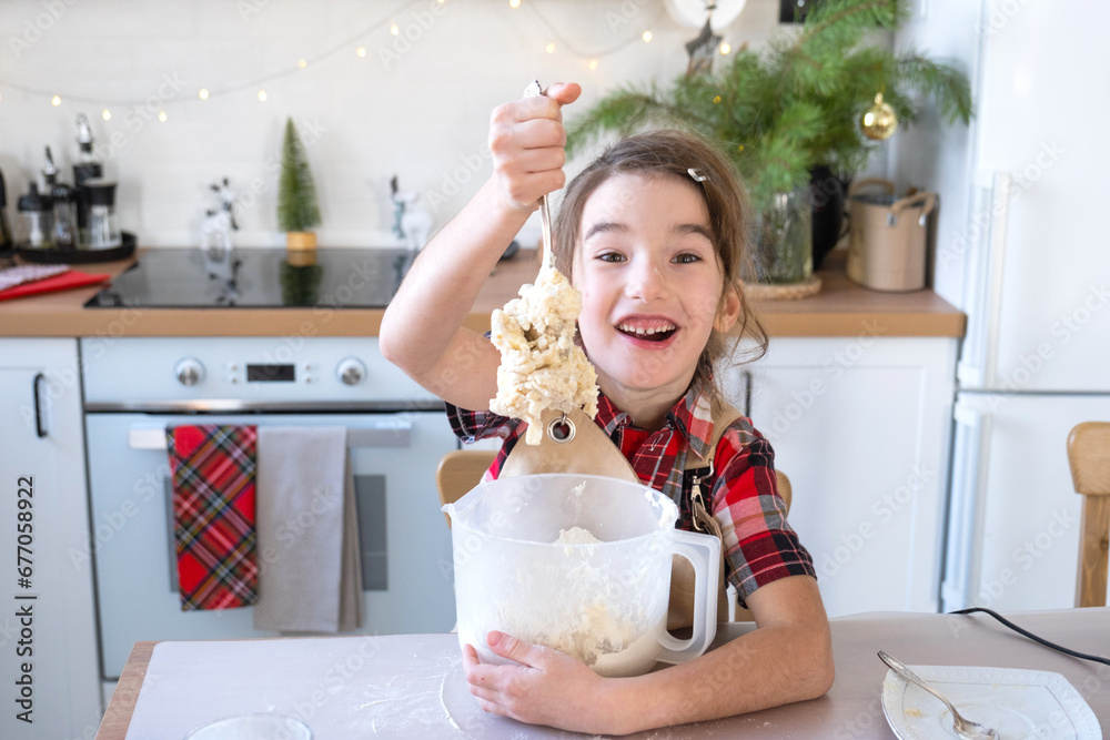 Daughter learning to cook helps in the white kitchen knead the dough in the bowl for gingerbread and cookies for Christmas and new year. Put the ingredients
