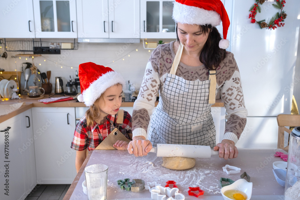Mom and daughter in the white kitchen are preparing cookies for Christmas and new year. Family day, preparation for the holiday, learn to cook delicious pastries, cut shapes out of dough with molds