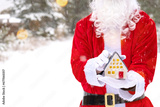 Santa carefully holds in his hands a tiny house in a small size in snow outdoor - a gift for Christmas, New year, the fulfillment of a dream. Protection, insurance, mortgage, purchase of housing
