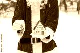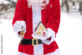 Santa carefully holds in his hands tiny house in small size and key with a keychain in snow outdoor - a gift for Christmas, New year, dream. Protection, insurance, mortgage, purchase of housing