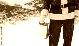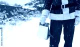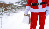 Santa Claus outdoor in winter and snow handing in hand eco paper bags with craft gift, food delivery. Shopping, packaging recycling, handmade, delivery for Christmas and New year