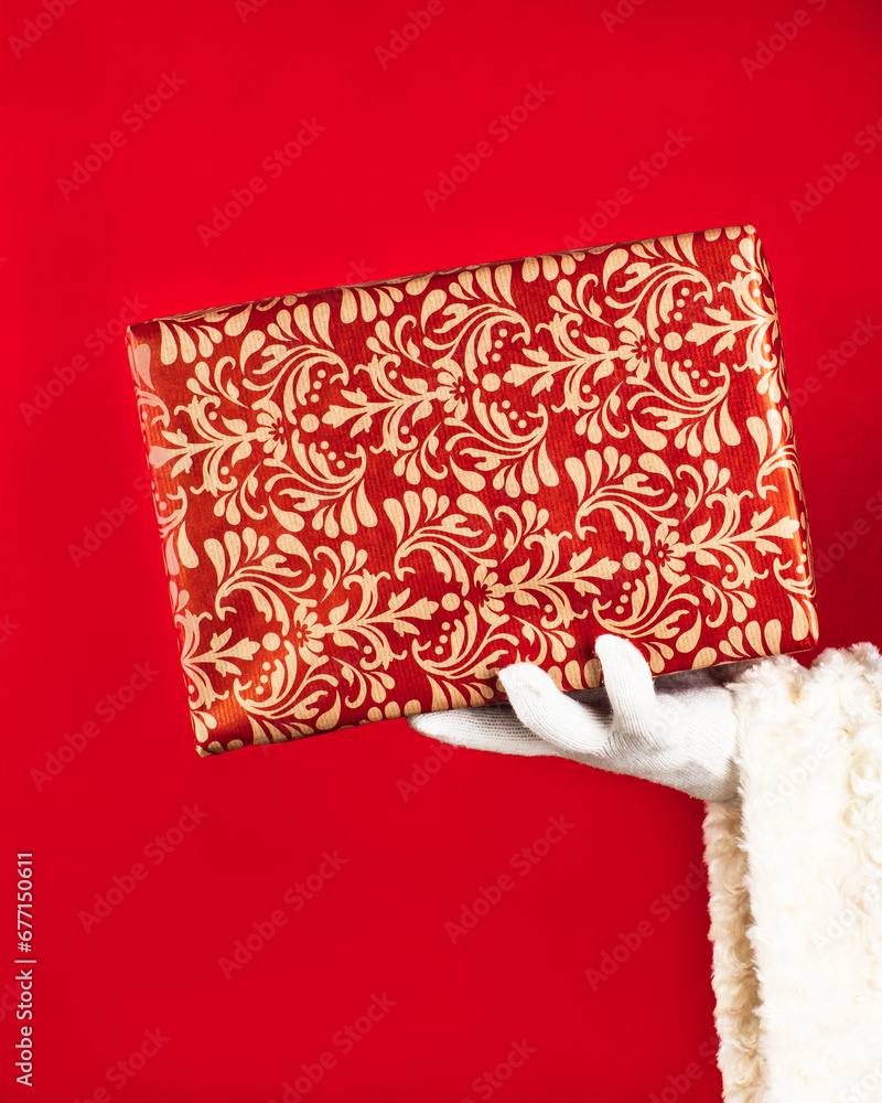 Santa Claus holds a paper box with gift in his hand on a red background with copy space. Giving a gift concept.
