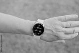 Close-up view of female hand adorned with smartwatch displaying high step count on blurred green background.