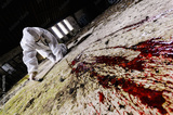 Scene of Crime Officer (SOCO) examines an area around some blood on a floor