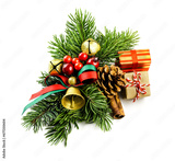 Christmas composition made of fir branches, cone, presents isolated on a white background.