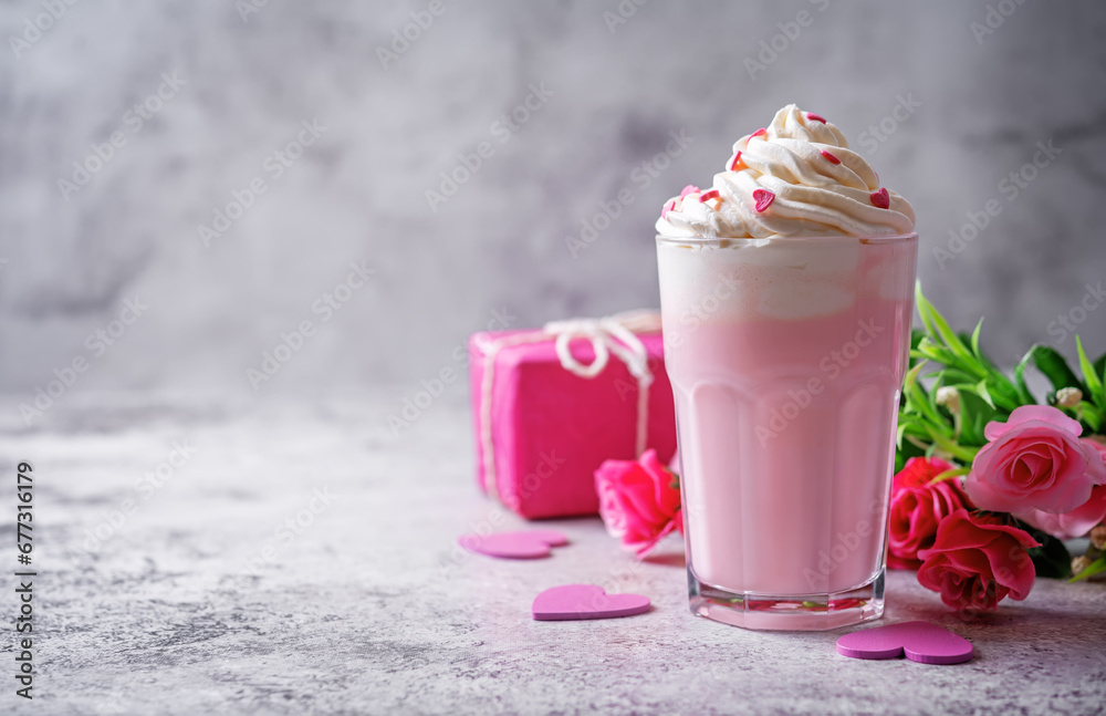 Hot white chocolate cocktail for Valentine's day holidays on a grey background