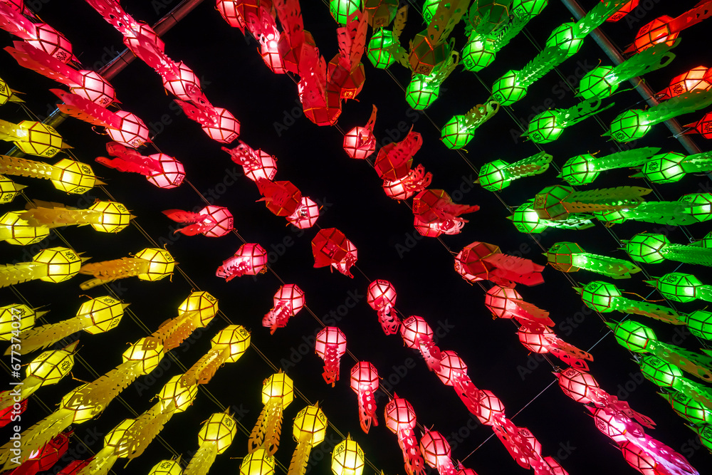 The light of the Beautiful Colorful Lanna lamp paper lantern background pattern are northern thai style lanterns in Phitsanulok Thailand.full moon the 12th month Be famous.