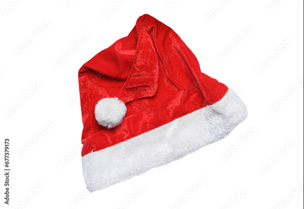 Santa Claus hat isolated on white, transparent background, PNG. Design element, traditional Christmas symbol. Red velour Santa hat, top view, flat lay.
