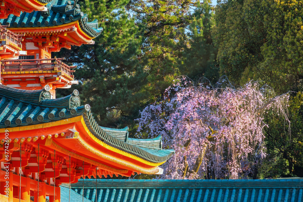 Beautiful full bloom cherry blossom at Heian Jingu Shrine in Kyoto, Japan