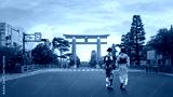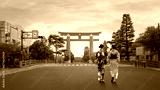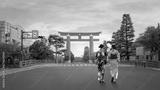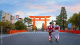 Young Japanese women in traditional Kimono dress at the Great Torii Gate of Heian Shrine in Kyoto, Japan