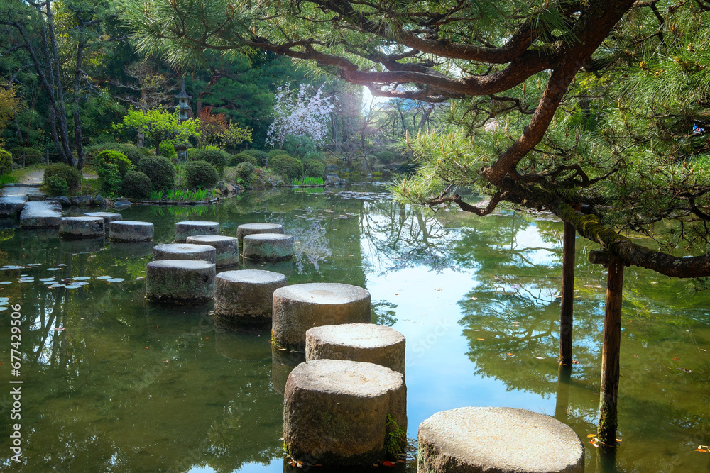 Kyoto, Japan - April 2 2023: Heian Jingu Garden is a garden with a variety of plants, ponds and buildings and weeping cherry trees, making it's one of the best cherry blossom spots in Kyoto